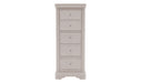Mabel 5 Drawer Chest of Drawers in Bone—a Vida registered design exuding timeless elegance. This drawer boasts a painted matte finish for a sleek appearance. The polished silver handles add sophistication, while classic decorative moulding enhances its charm. With elegant curves throughout, it complements any bedroom decor with grace and style.