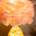 The raya led base feather lamp in pink stands 40cm tall, featuring a whimsical design adorned with soft, feather-like accents. this lamp emits a warm, inviting glow, creating a cozy atmosphere perfect for bedrooms, or living spaces.